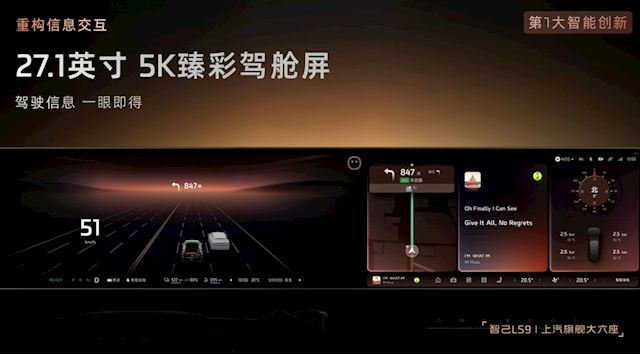 内饰启用了家族化最新的方案,其最大典型的特征就在于前排使用了三块屏,其中全液晶仪表盘和中控屏为一体式,尺寸为27.1英寸,分辨率高达5K,副驾一侧使用了海湾式内凹造型,并且提供了一块15.6英寸3K MiniLED娱乐屏。