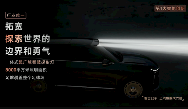 和在售的智己系列车型不同,LS9采用全新的设计语言,封闭式前格栅搭配前发动机舱盖隆起的多条筋线,营造了肌肉感和力量性,车头星环式贯穿灯带,搭配两侧T字形灯组,强化辨识度,行业首创一体式超广域智慧探射灯,最大8000㎡照明面积。
