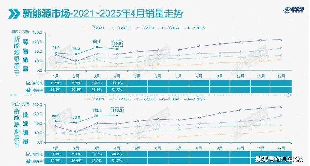 新能源乘用车市场同样表现出色,4月份零售销量达到90.5万辆,同比增长33.9%,环比下降8.7%。新能源车的国内零售渗透率达到51.5%,环比增长0.4个百分点,创年内新高。1至4月,新能源乘用车累计零售332.4万辆,同比增长35.7%,成为推动中国汽车产销增长的主要力量。